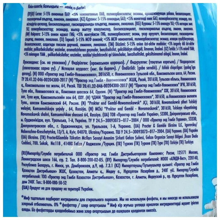 За 6 килограмм я отдала всего 399 рублей. За последние года перепробовала множество средств для стирки , как жидких так и порошков. Пока решила остановилась на МИФе. Порошок можно использовать, как для стиральных машинах, так и для ручной стирки. На мой взгляд порошок универсальный, с маркировкой для цветного. Откровенно говоря я стираю им и белые вещи. Серости тканей пока не заметила. Пениться порошок отлично, пенообразование в меру. У меня вода жёсткая, поэтому сильной пены нет. Порошок отлично освежает поношенное бельё. Придает белью свежий внешний вид. Благодаря энзимам прекрасно отстирывает свежие загрязнения. При сильных загрязнениях я предварительно замачиваю или натираю места с загрязнениями хозяйственным мылом. И при стирке всегда добавляю кислородный отбеливатель. Порошок не содержит хлора, хотя для меня это не показатель. Также порошок не содержит фосфаты, это значимый показатель. Не все производители могут этим похвастаться. После стирки белье приятно пахнет свежестью. Ткань на ощупь мягкая, имеет тонкий аромат. Гранулы растворяюсь полностью. Из лотка вымывается до конца. Ничего не остаётся. Выполаскивается отлично, нет белых разводов, на ощупь белье не скользкое. При стирки я всегда использую кондиционер, поэтому мне кажется, что у порошка запах после стирки слабый. Подводя итог, хочу сказать, что я не пожалела, что купила это порошок. Соотношение цена качество отличное!! За такие деньги, это находка. Однозначно рекомендую к покупке данный порошок!!! |