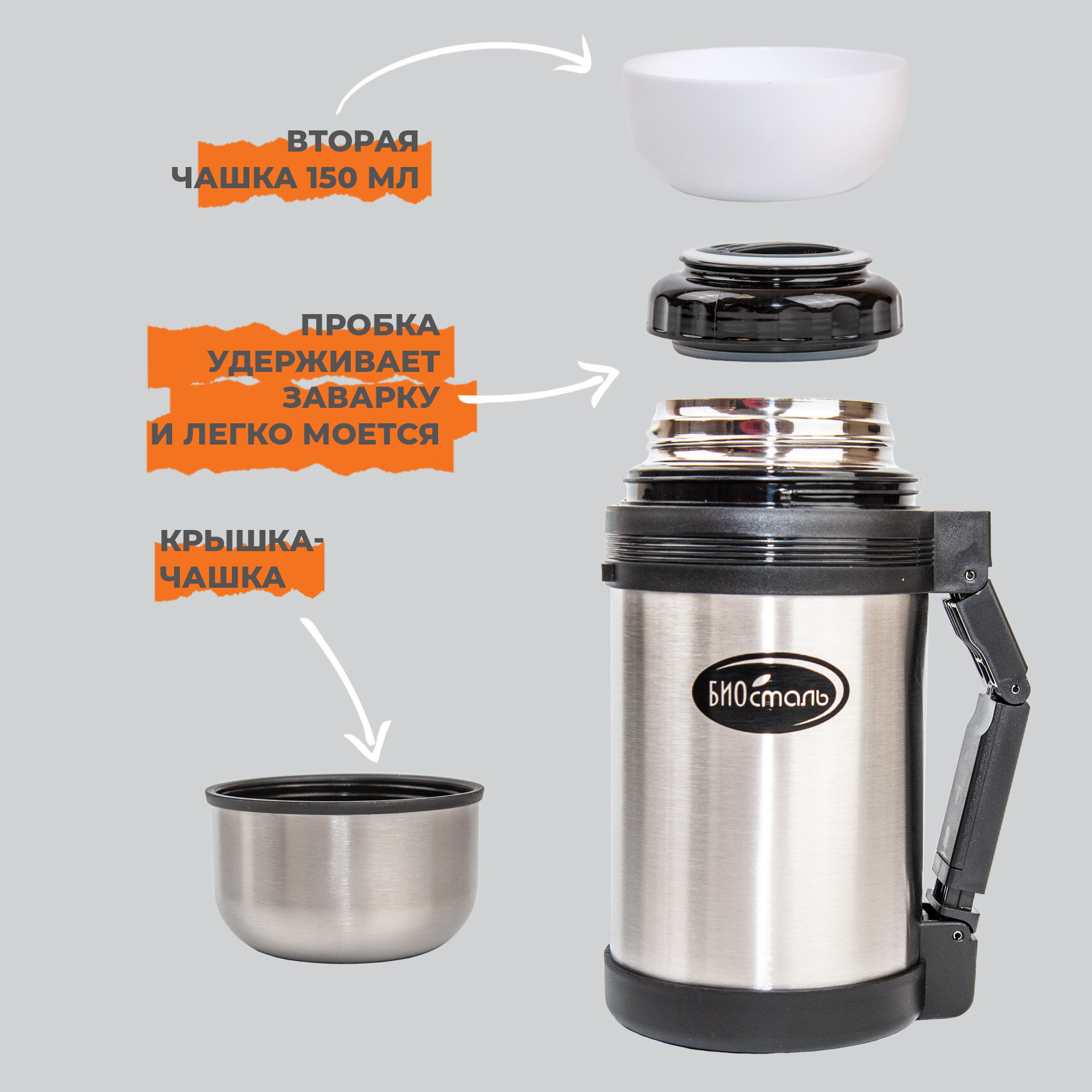 Термос универсальный Вакуумный, доп чашка и ручка для переноски, Биосталь/Biostal (2),NG-2000-1