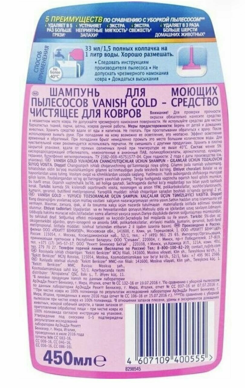 Шампунь для ковров Vanish Gold, для моющих пылесосов, 450 мл 1578565 интересное: