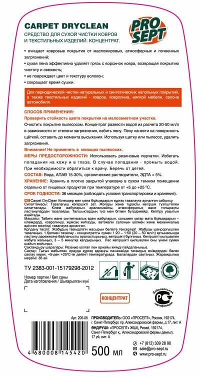 Ниже Вы можете прочитать отзывы на PROSEPT Шампунь для сухой чистки ковров и мягкой мебели Carpet DryClean, 0.5 л, ознакомится с подробными характеристиками, посмотреть интересные обзоры и фотографии на PROSEPT Шампунь для сухой чистки ковров и мягкой мебели Carpet DryClean, 0.5 л.