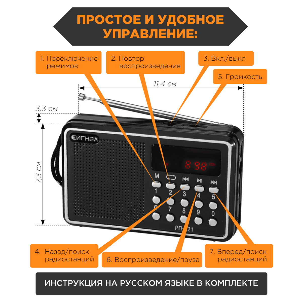 Сигнал РП-221 FM 88-108МГц, акб 400mA/h, USB/microSD, дисплей