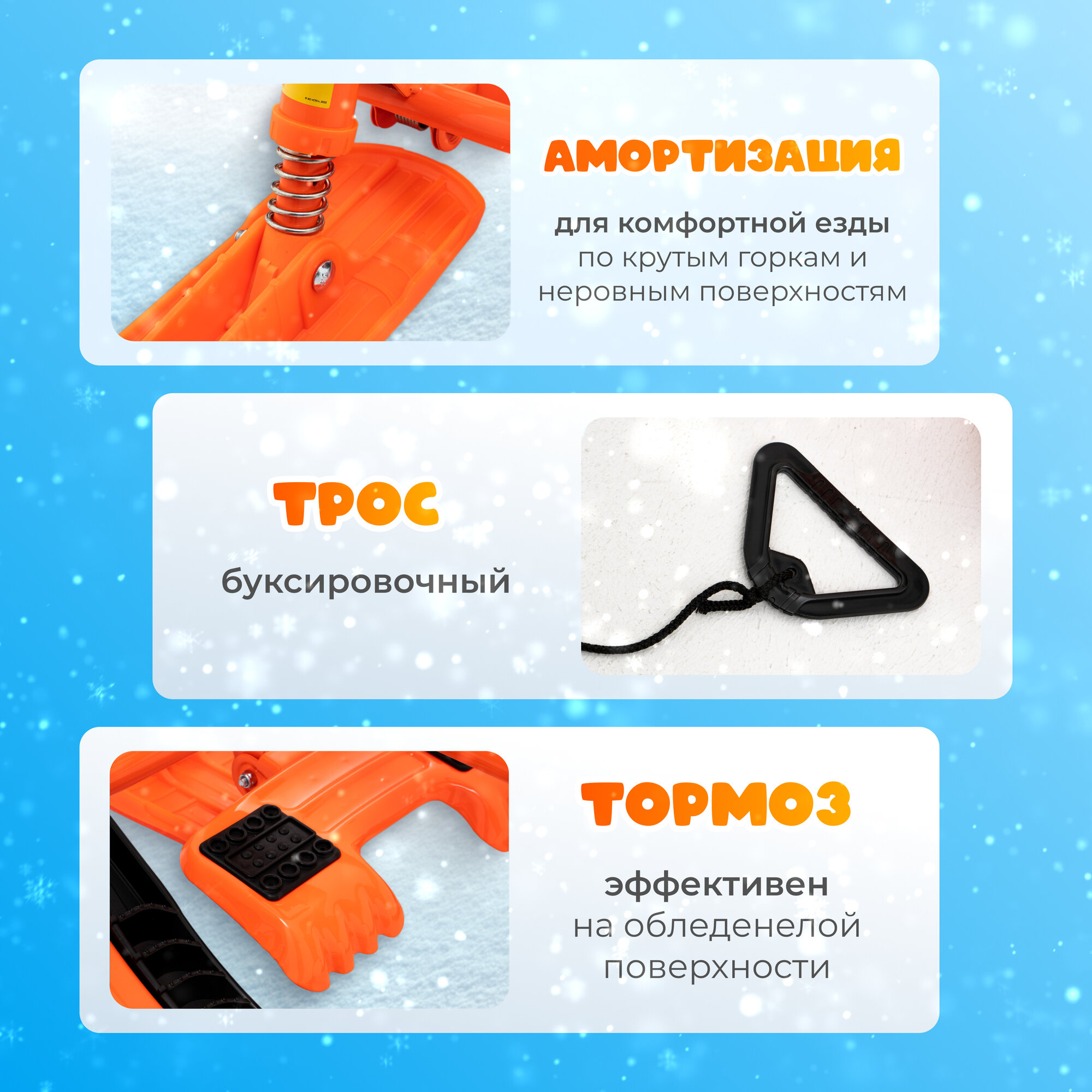 | Плюсы: | Качественный снегокат. Нагрузка до 100 кг. Можно кататься взрослому с ребёнком. Руль безопасный, есть тормоз. |