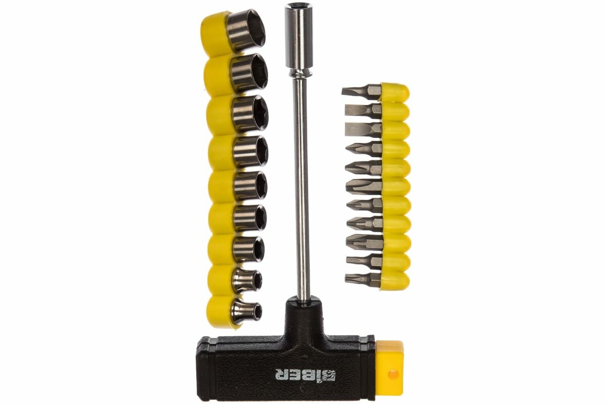 Отвертка Т-образная с набором бит и торцевых головок Biber 85553, 20 предм., желтый/черный