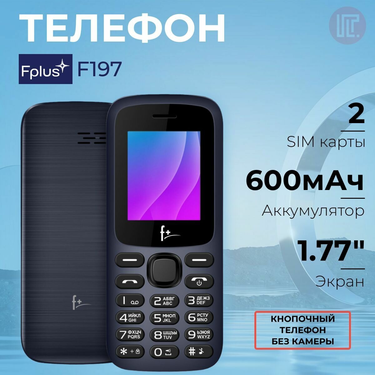 F+ F197 Dark blue, 1.77 128x160, 32MB RAM, 32MB, up to 32GB flash, 0.08Mpix, 2 Sim, BT v2.0, Micro-USB, 600mAh, 70g, 114 ммx48 ммx13 мм