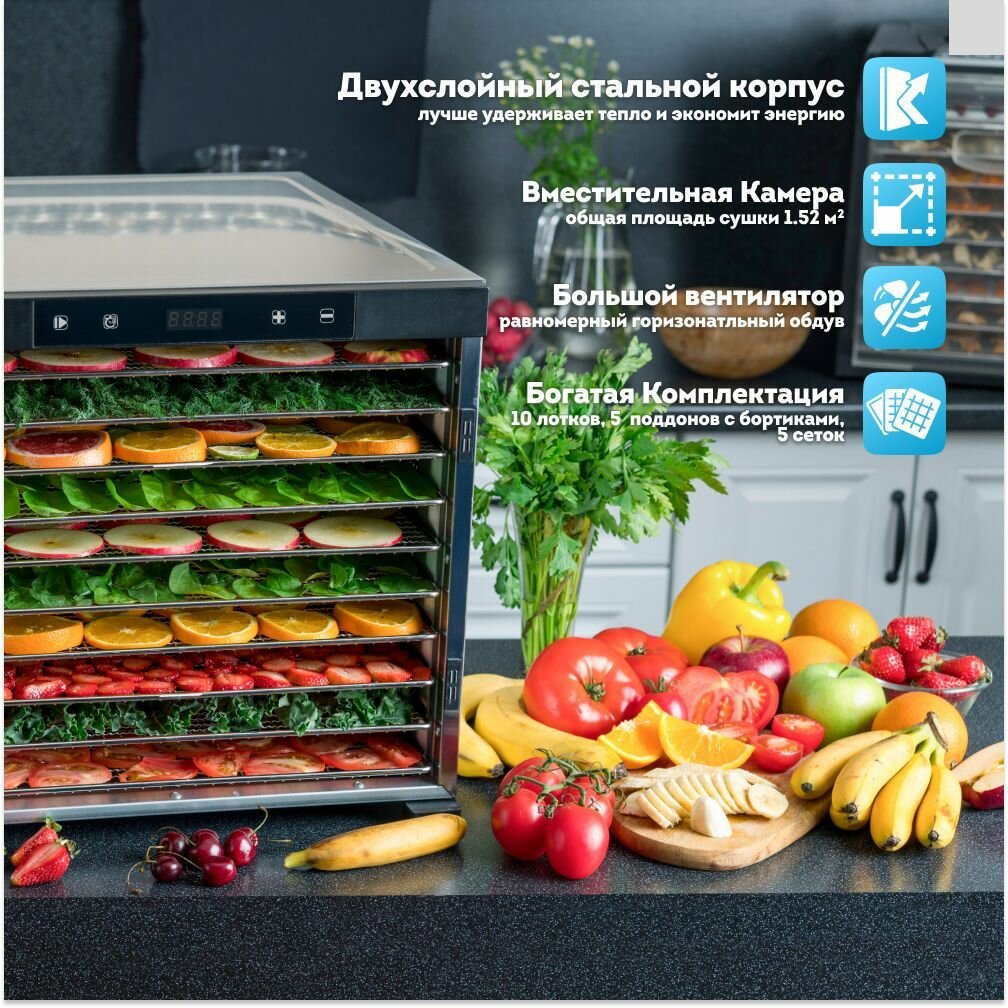 + дополнительные пластиковые лотки. Сушил фрукты, ягоды, различные травы, микрогрин, пастилу. Пользовался активно, не только для семьи, но и для бизнеса, сотни килограмм товара пересушил, бывало сутками работала, партия за партией. Ничего не ремонтировал, не обслуживал, не допиливал. Все ок, работает и выглядит как новый. Небольшой недочет выявил один - пару-тройку раз тёрся рядом, задевал сенсорные кнопки (или дети ползали, задевали), что вызывало запуск сушки или ее остановку (он у меня постоянно подключен к питанию), потому блокировка не помешала бы, хотя это не особо критично. В общем - годная вещь, берите, не пожалеете. |