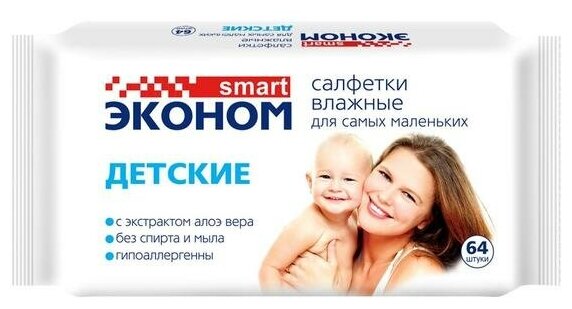 Влажные салфетки Эконом smart Детские с экстрактом алоэ вера, липучка, 64 шт.