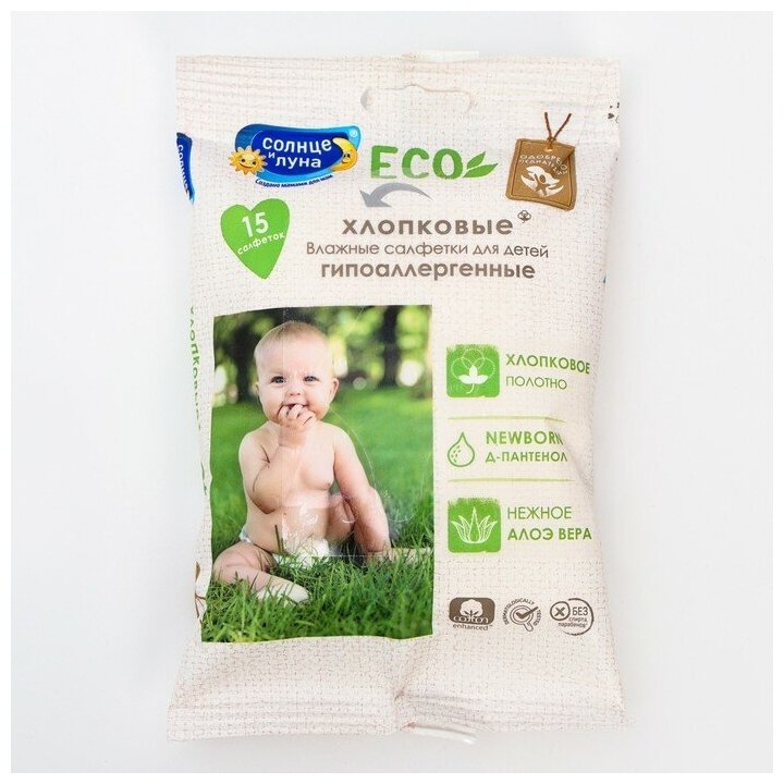 Солнце и Луна Салфетки влажные для детей с алоэ вера (без спирта, парабенов, силиконов и минеральных масел), 15 шт