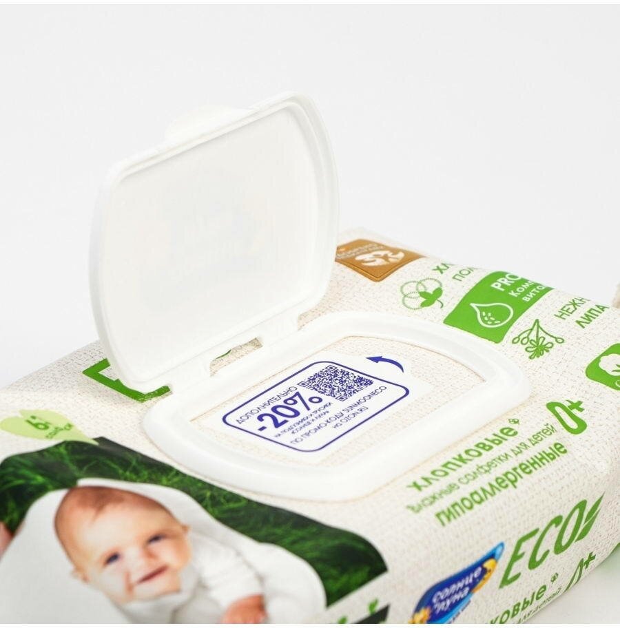 Салфетки влажные Солнце и Луна детские, "Eco", 0+, хлопковые, с экстрактом липы, 100 шт (10303)