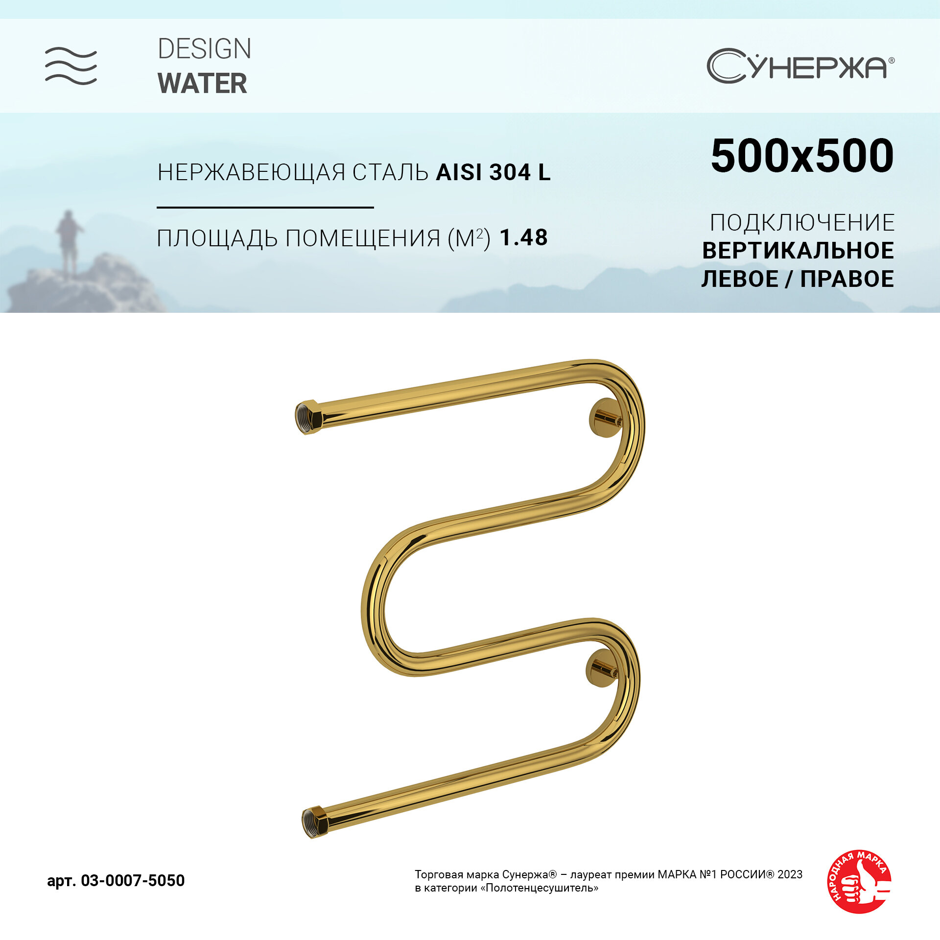 СУНЕРЖА М-образный Полотенцесушитель 500х500 нерж. сталь, нак. гайка 1" 00-0007-5050