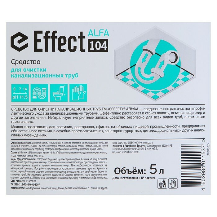 Профессиональное чистящее средство Effect A104 (ALFA 104) для канализационных труб и сливов, 5 л