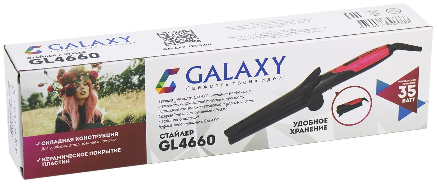 Стайлер Galaxy GL 4660, 35 Вт, керамическое покрытие, черно-розовый
