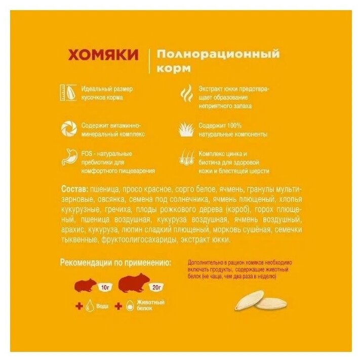 | Отзыв: | Давно кормлю хомяков этим кормом. Шикарный. Хомячки его едят, активные. Мне всё нравится |