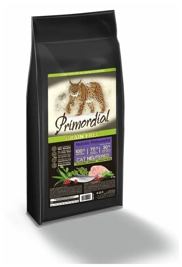 Купить PRIMORDIAL CAT STERILIZZATO беззерновой для взрослых кастрированных котов и стерилизованных кошек с индейкой и сельдью (6 кг)