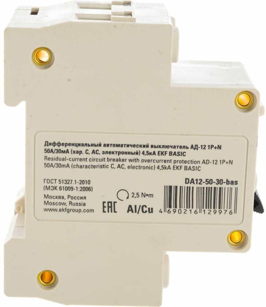 EKF Basic АД-12 Диф. Автомат (C) 1P+N 50А /30мА тип АС 4,5кА , электронный, EKF, арт.DA12-50-30-bas