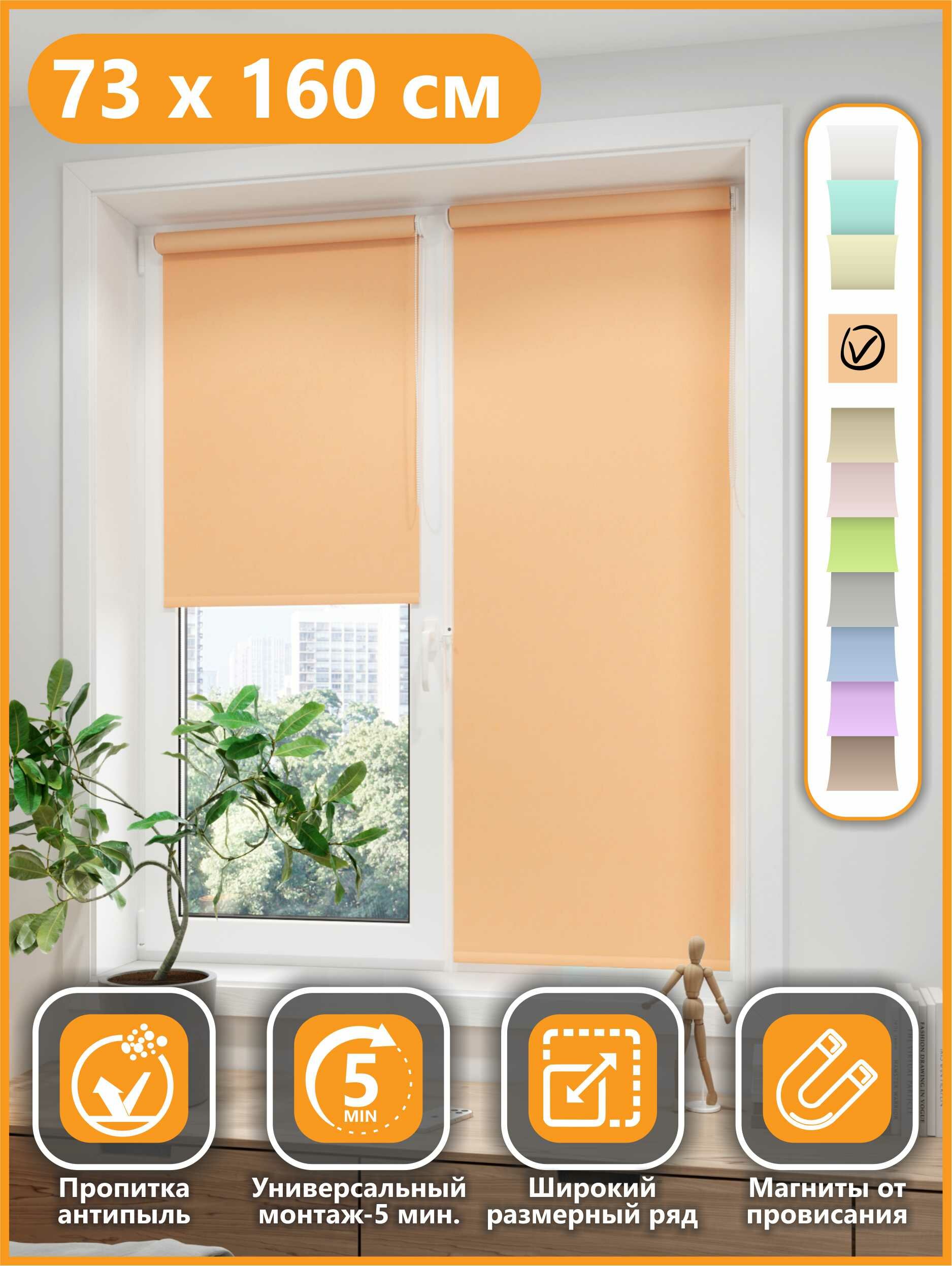 62*160 Универсальная рулонная штора с/з 80%, Однотонный Персик 66986