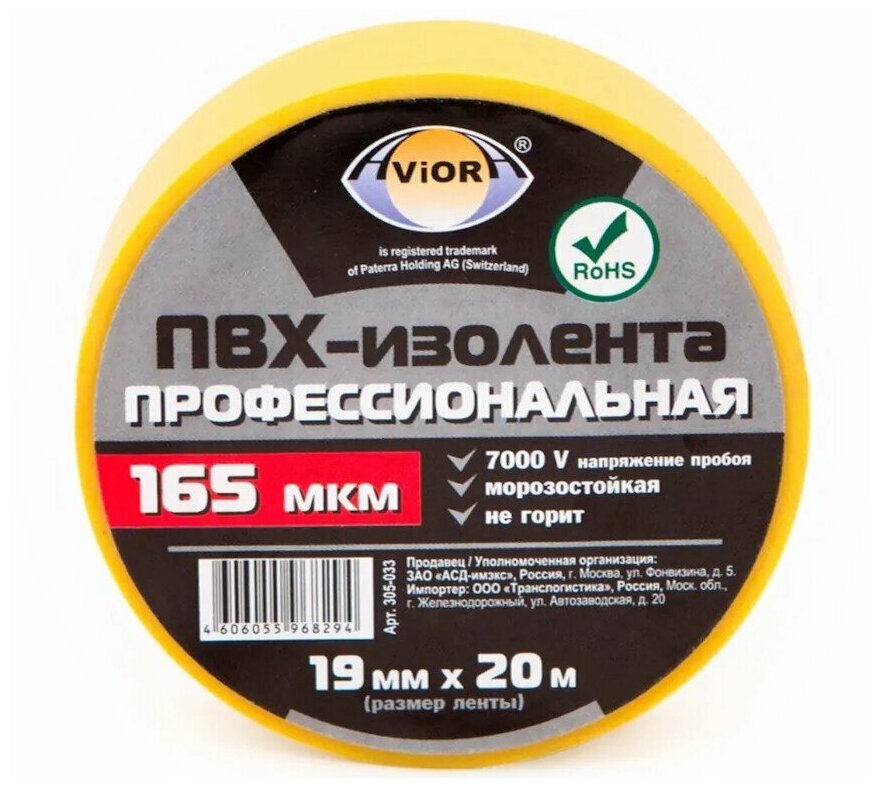 Купить Изолента ПВХ "профессиональная", 19 мм х 20 м, AVIORA (желтая) (305-033)