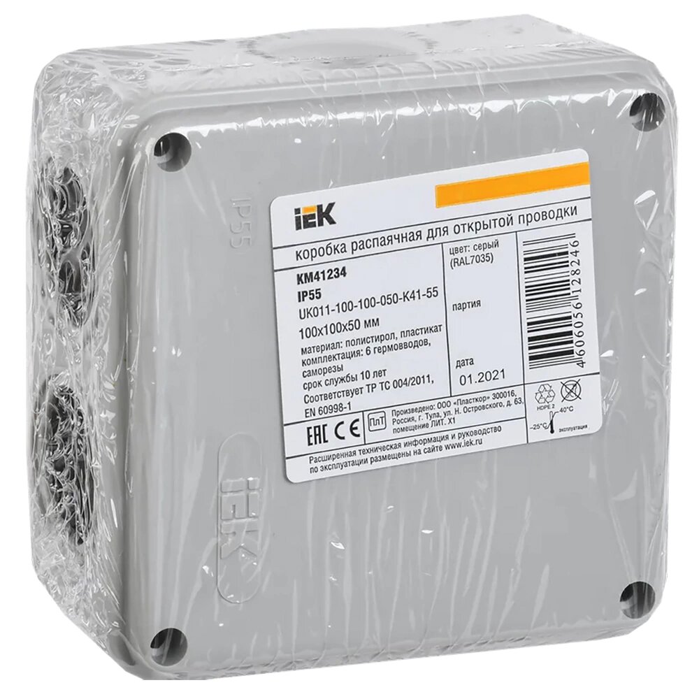 Iek UKO11-100-100-050-K41-44 Коробка КМ41233 распаячная для о п 100х100х50 мм IP44 RAL7035, 6 гермовводов
