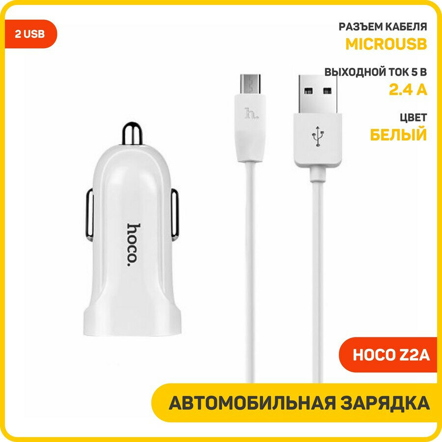 Автомобильное зарядное устройство (АЗУ) Hoco Z2A (2 USB) + кабель MicroUSB, 2.4 А, белый