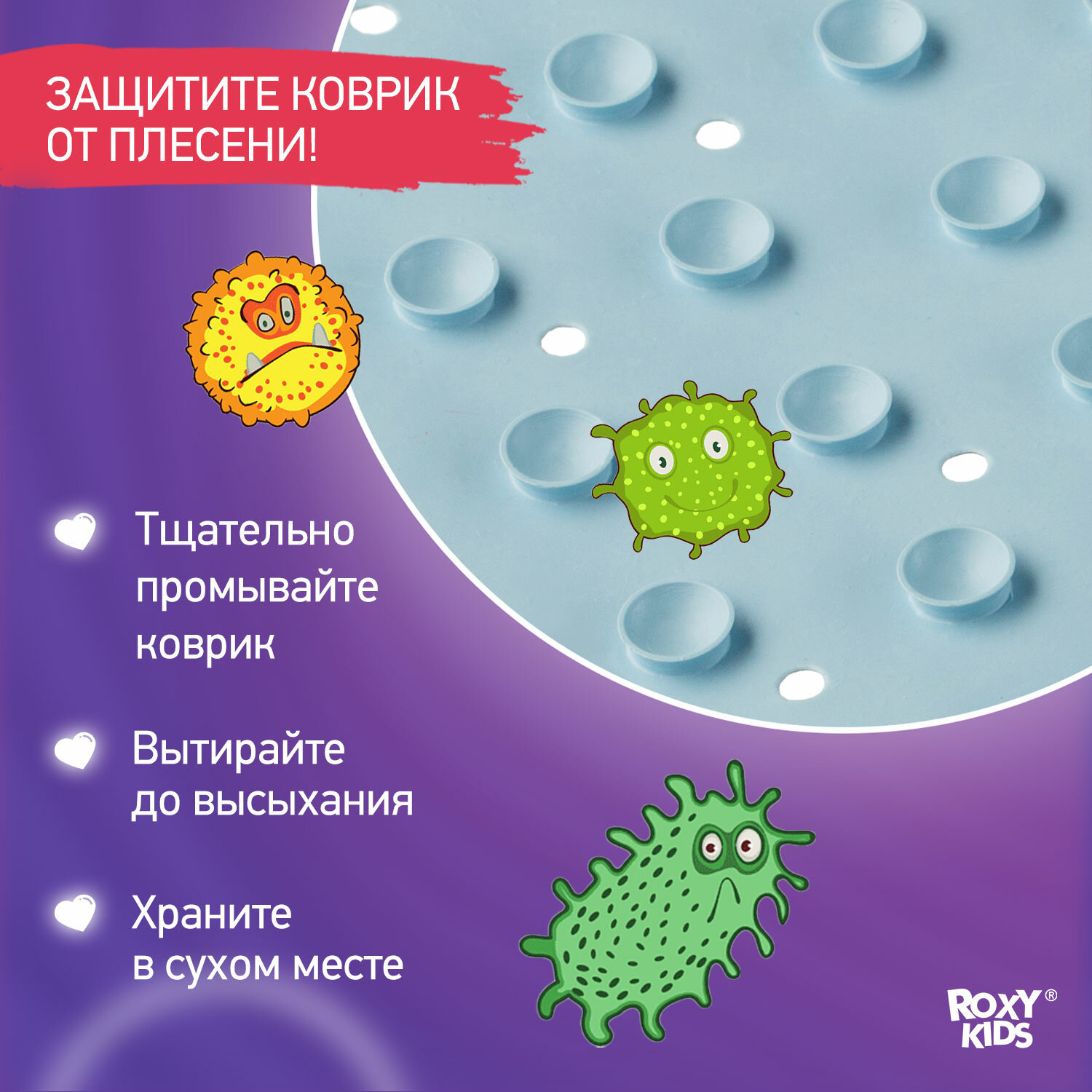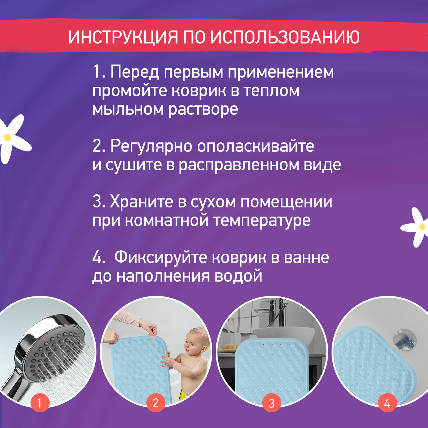 Большой размер, закрывает почти всё дно стандартной ванны. Нет запаха резины. Все липучки хорошо приклеиваются. Ребенок не скользит на коврике. При своевременном просушивании плесень не образуется.