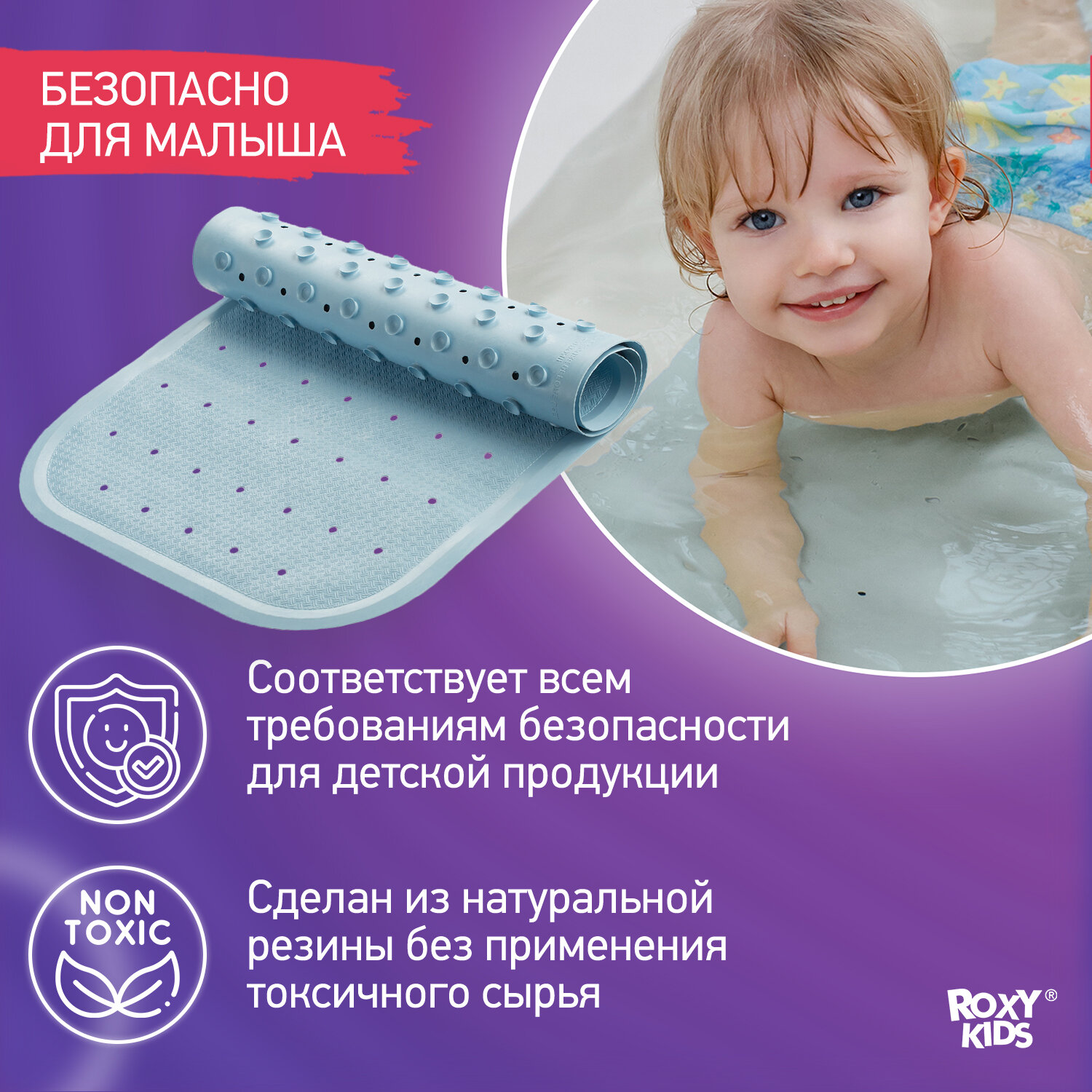 Не скользит как сам коврик по ванной, так и ребёнок на нём.