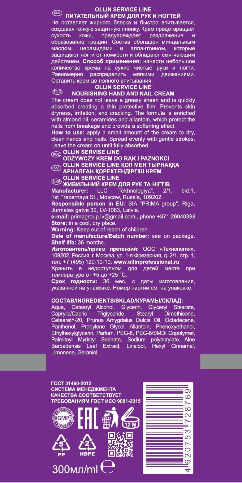 OLLIN SERVICE LINE NOURISHING CREAM HAND&NAIL питательный крем для РУК И ногтей 300 МЛ