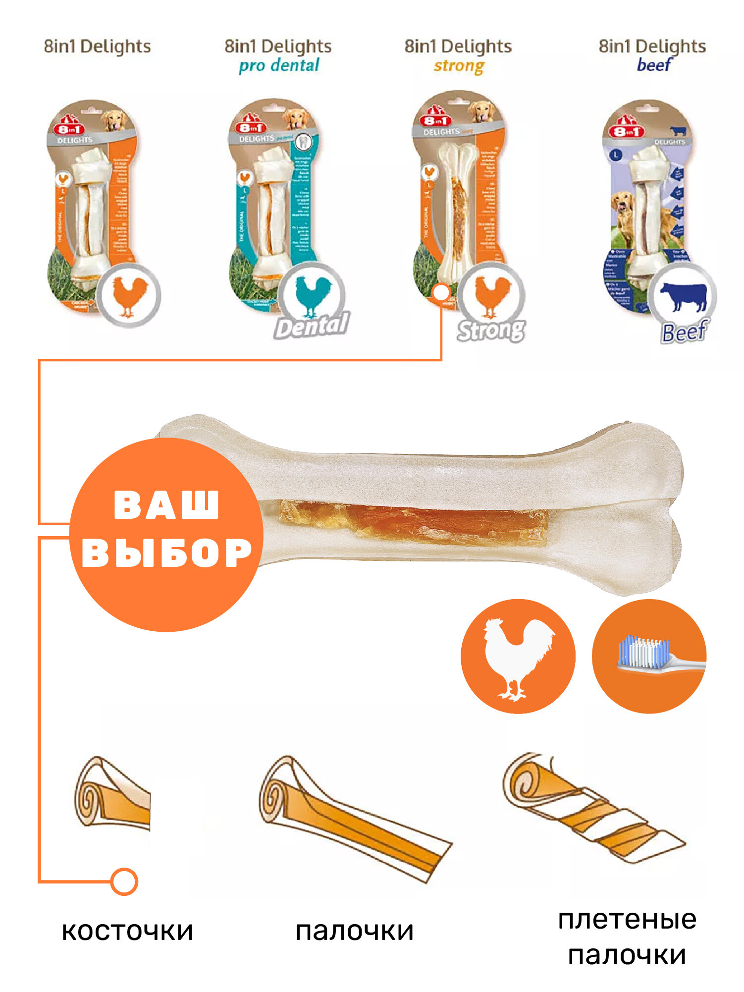 Купить Косточка прессованная 8in1 Delights Strong для собак, с куриным мясом в жесткой говяжьей коже, S ( 11 см) , 1шт х 55 г