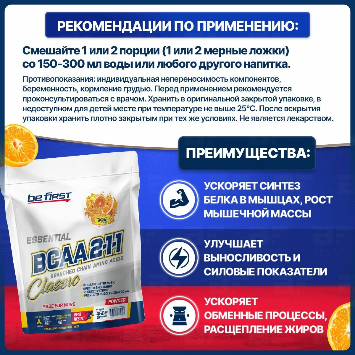 Купить BCAA Be First 2:1:1 Classic Powder, апельсин, 450 гр.