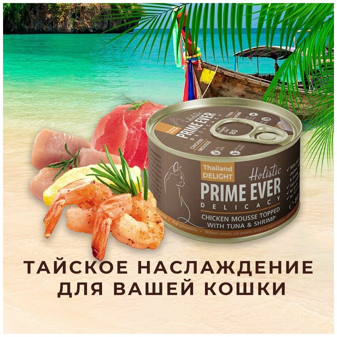 Влажный корм для кошек, цыпленок с тунцом и креветками, холистик, Prime Ever, упаковка 12 шт х 80 г