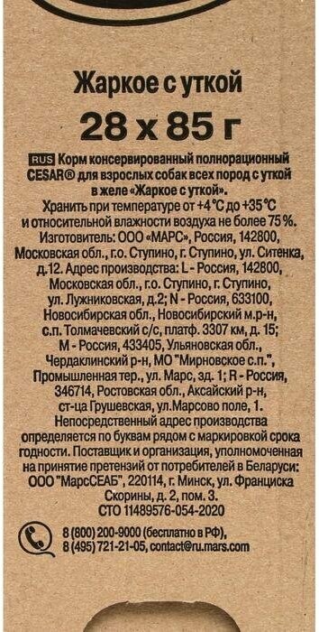 Корм Cesar (в желе) для собак, жаркое с уткой, 85 г x 28 шт