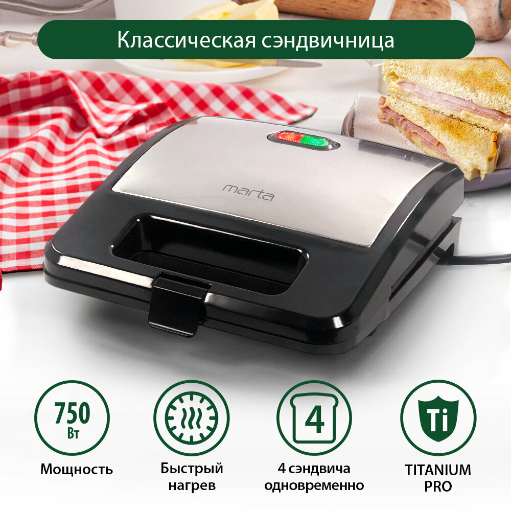 Бутербродница электрическая Marta MT-1755 антипригарное покрытие черная 750Вт интересное: