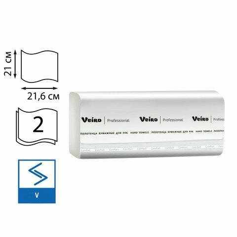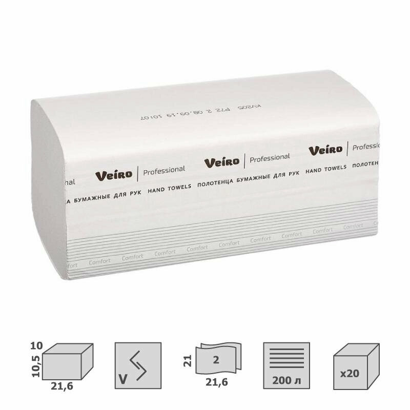 Полотенца бумажные Veiro Professional для диспенсера, Prof Comfort, 2 слоя, 200 листов, 20 пачек, V-сложения