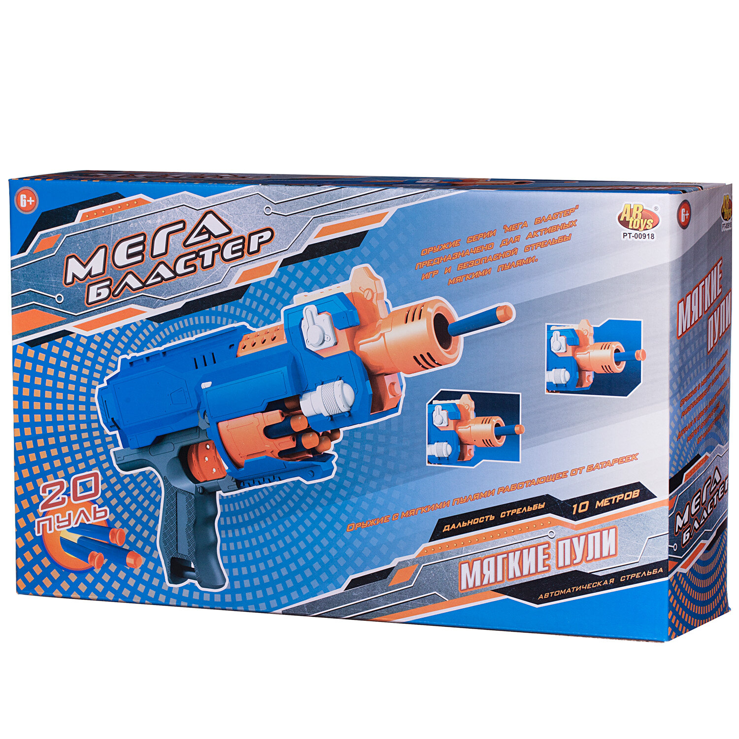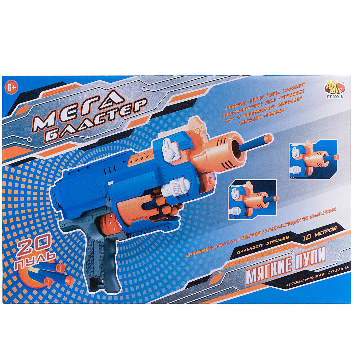 Мегабластер Бластер синий с 20 мягкими пулями, автоматическая стрельба, в коробке