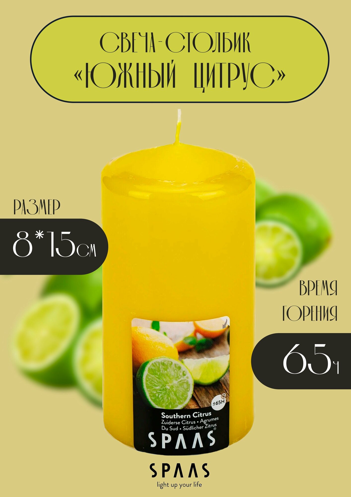 Свеча-столбик ароматическая южный цитрус 8х15см 65ч 0004800401 интересное: