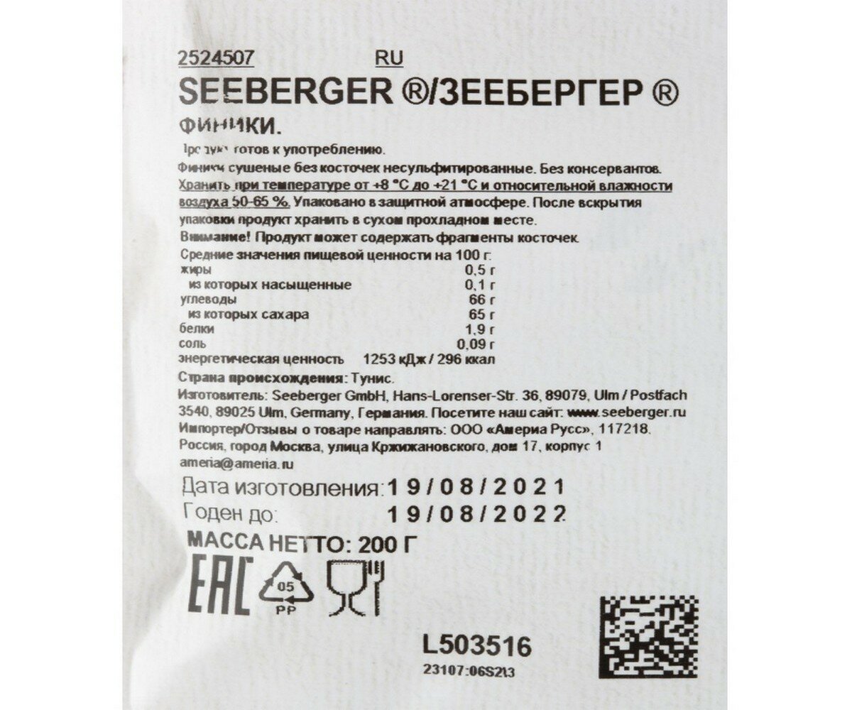 Финики Seeberger сушеные без косточек, 200 г интересное: