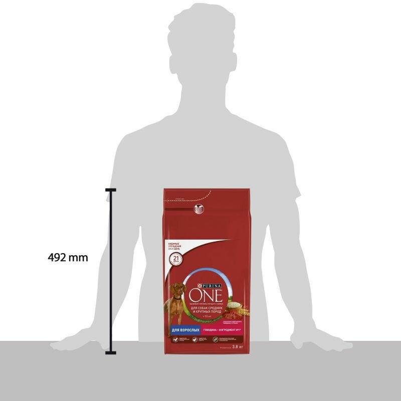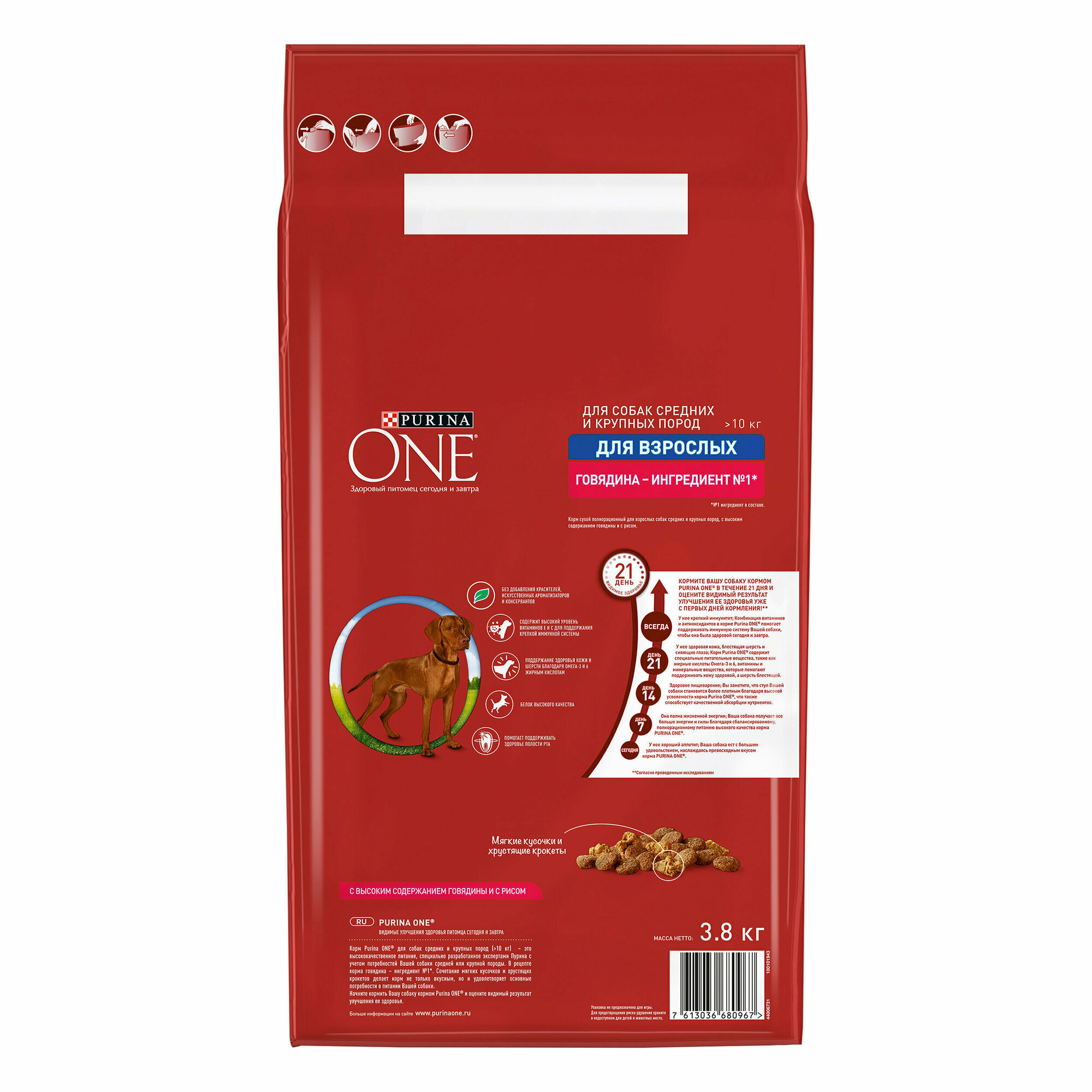 Сухой корм Purina ONE для взрослых собак средних и крупных пород, с высоким содержанием говядины и с рисом, Пакет, 3,8 кг