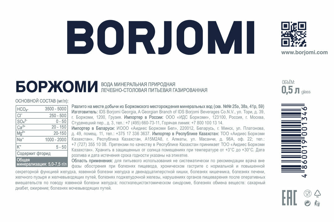 Минеральная вода Borjomi (Боржоми) газированная 0.5 л стекло 1 штука