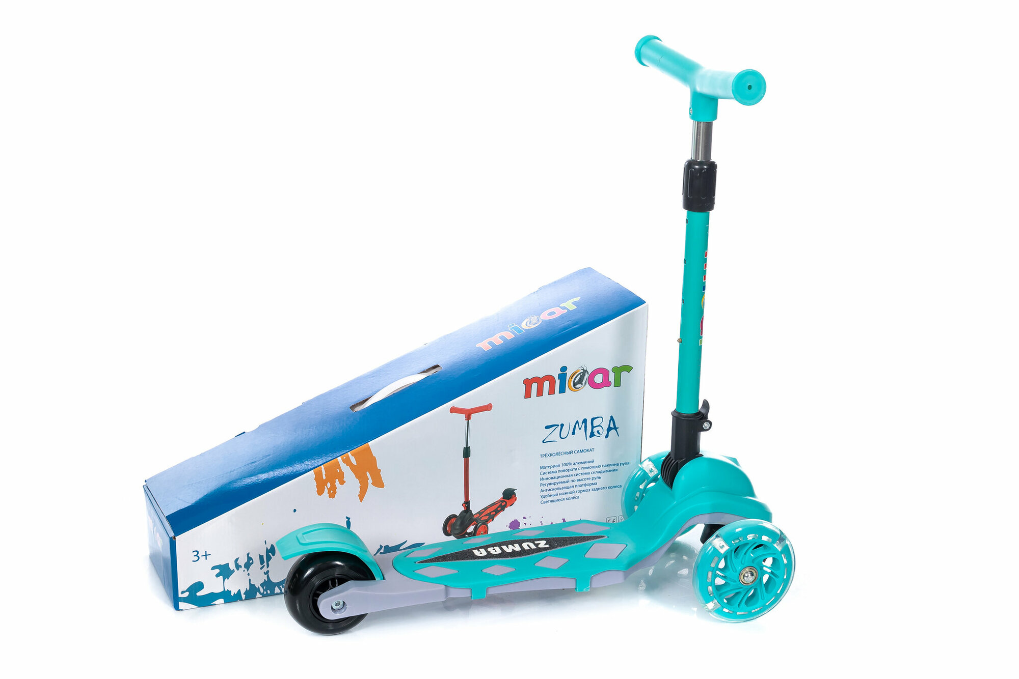 Самокат трехколесный со светящимися колесами Micar Zumba 2022 серый, голубой
