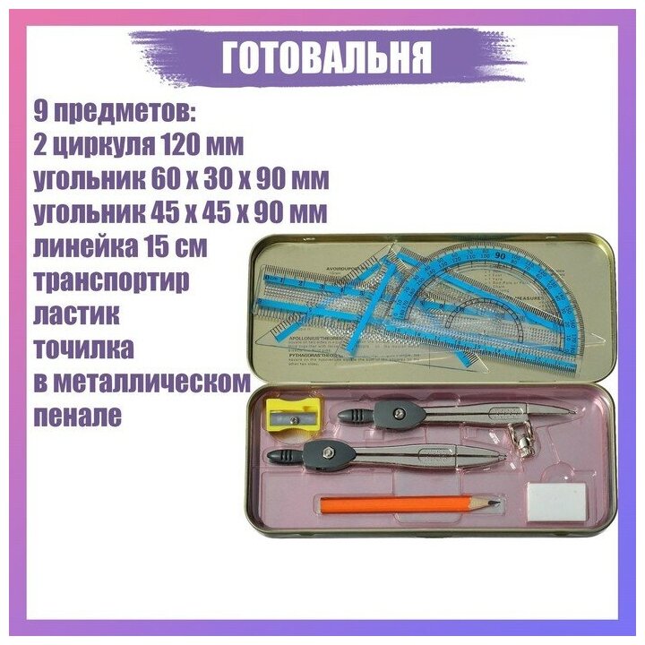 Готовальня 9 предметов: 2 циркуля 120 мм, угольник 60 х 30 х 90 мм, угольник 45 х 45 х 90 мм, линейка 15 см, транспортир, ластик, точилка, в металлическом пенале