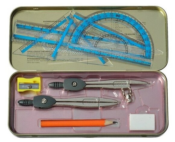 СохранитьCalligrata Готовальня 9 предметов: 2 циркуля 120 мм, угольник 60х30х90 мм, угольник 45х45х90 мм, линейка 15 см, транспортир, ластик, точилка, в металлическом пенале интересное: