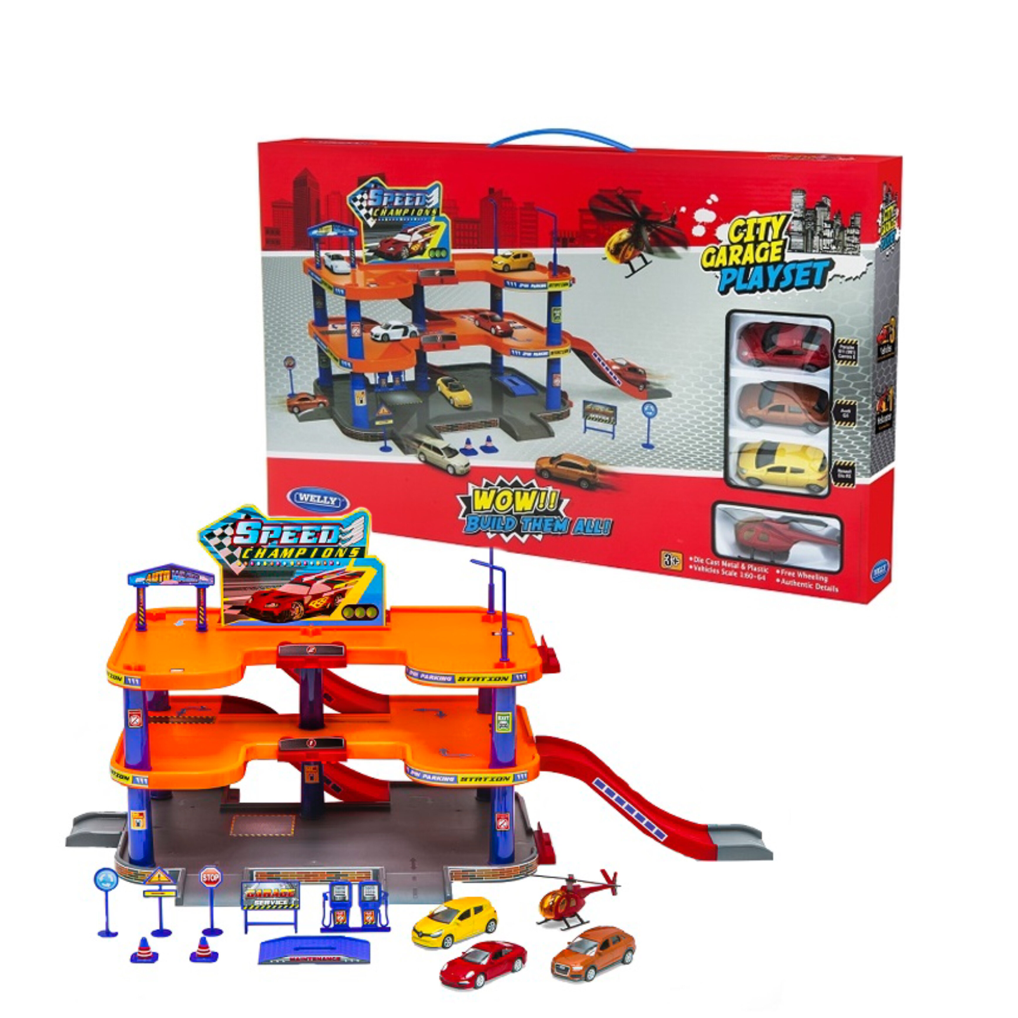 Купить Игровой набор Welly Гараж 3-х уровневый, 3 машинки и вертолет/паркинг/трек арт. 96050