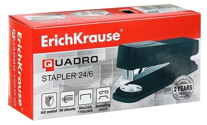 Степлер ErichKrause Quadro, № 24/6, до 30 листов, чёрный