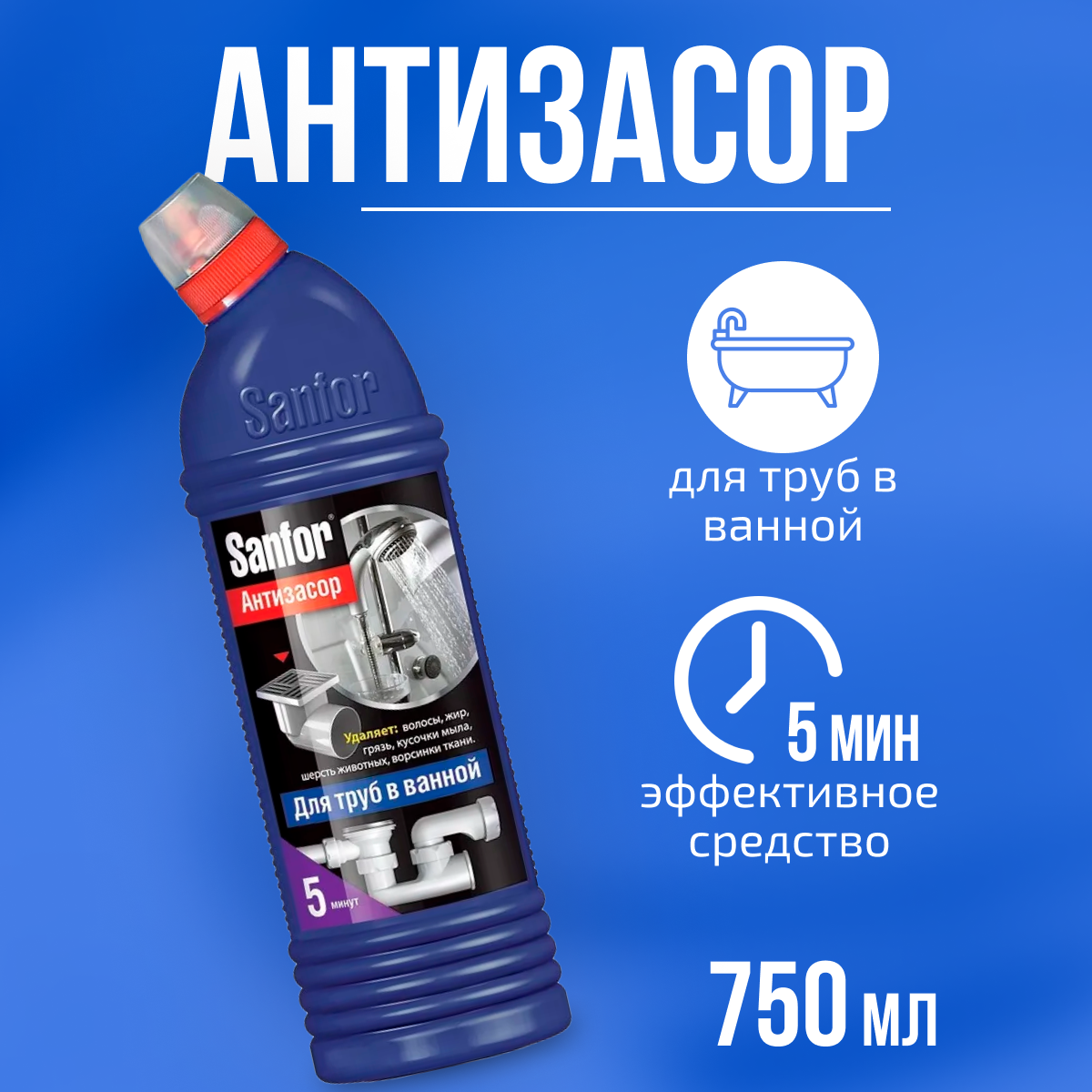 Купить SANFOR Средство для очистки канализационных труб Антизасор (для труб в ванной) 750 мл