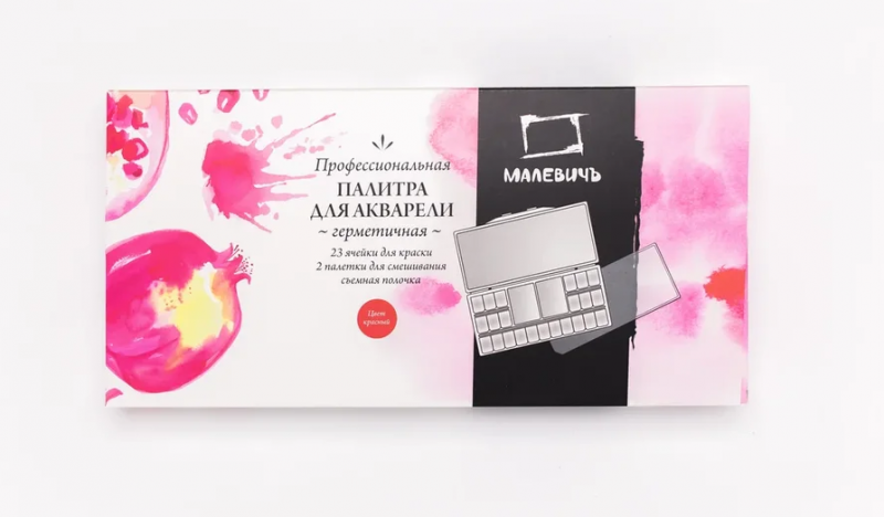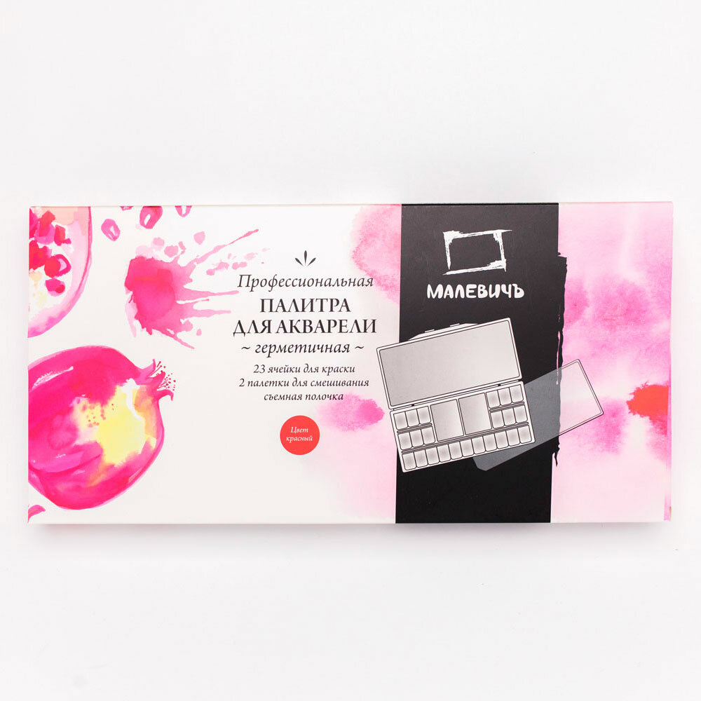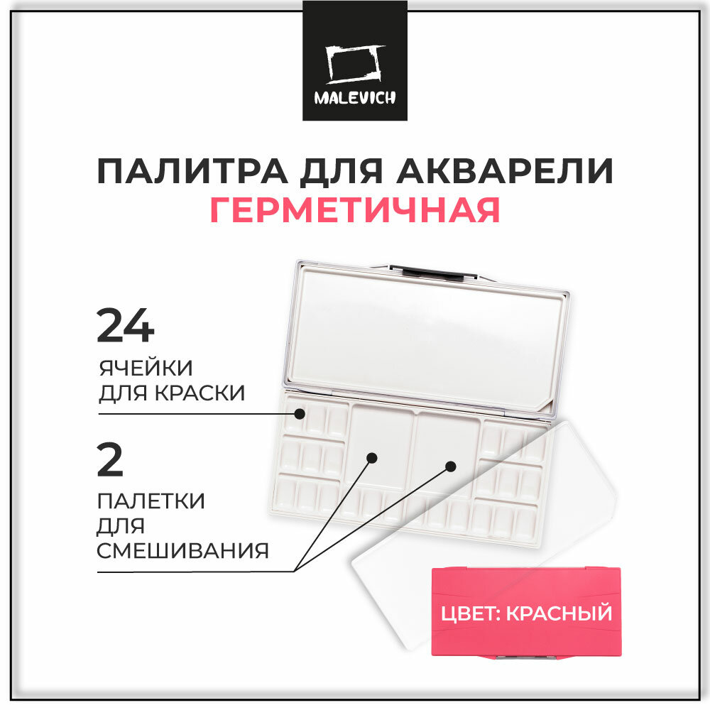 Палитра Малевичъ для акварели профессиональная герметичная, 23 ячейки, красная, 15,8х32 см