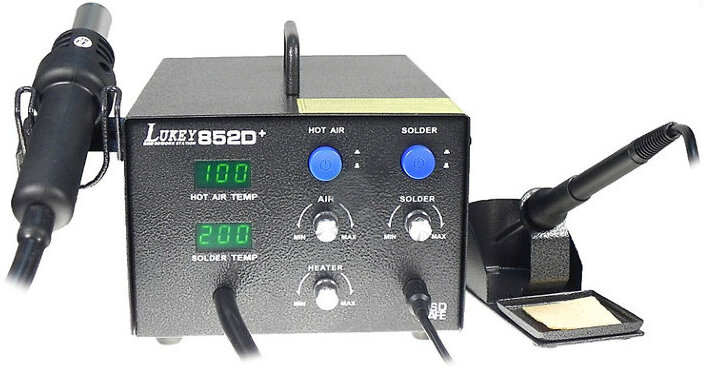 | Плюсы: | За свою стоимость Lukey 852D+ это отличная термовоздушная паяльная станция, с хорошей комплектацией. Она компрессорная, что является большим плюсом. Также нагревательный элемент паяльника ни какой нибудь а японский. Ну и насадки для фена универсальны, и их всегда можно найти. Отличный подарок для электрика. |