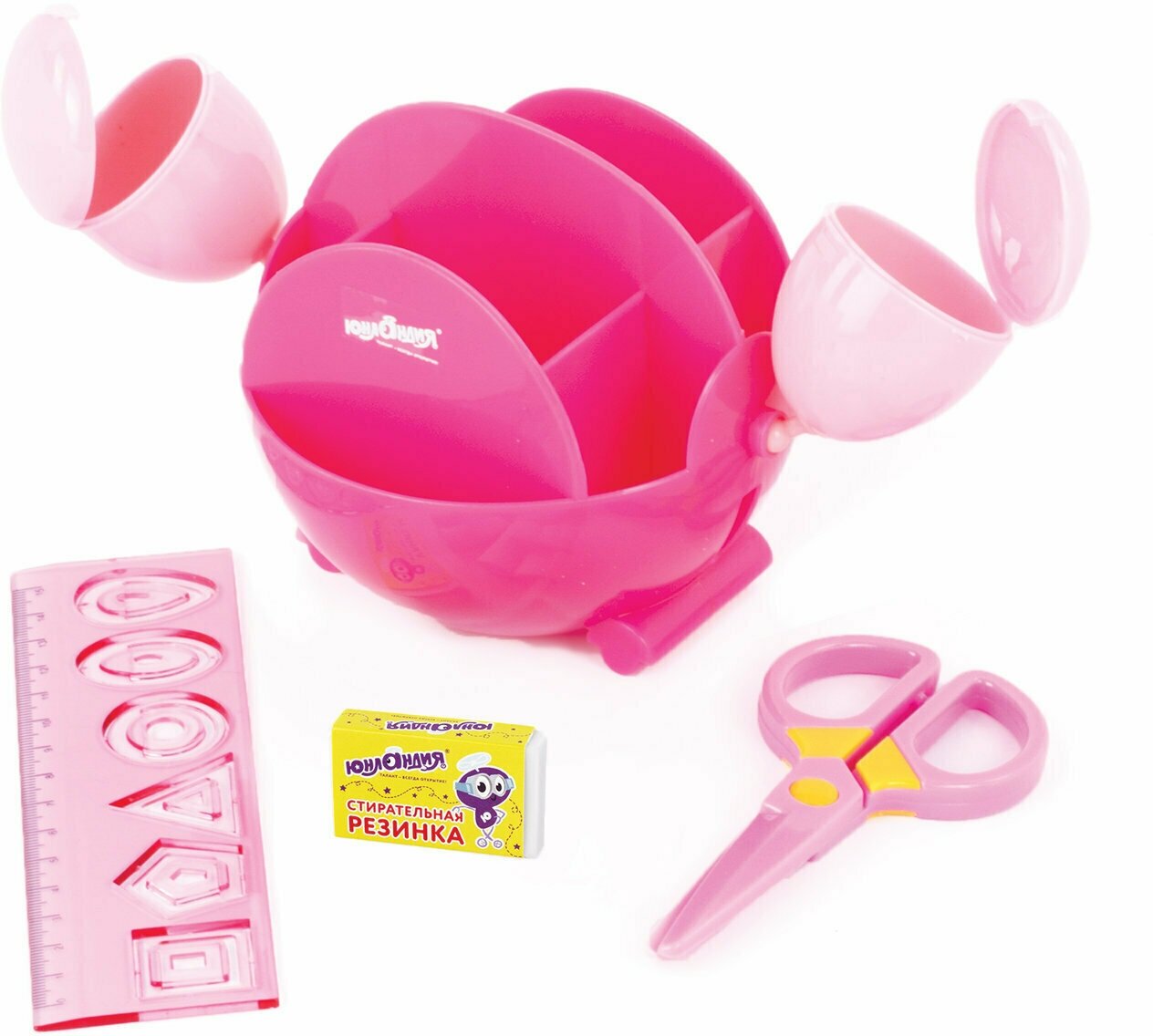 Канцелярский детский набор юнландия краб, 4 предмета: подставка, линейка со скрепками, ножницы, ластик, цвет — розовый, блистер, 236958