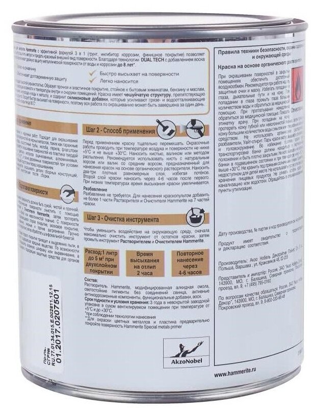 Остановился на Hammerite изготавливается по формуле «три в одном». Покрытие уже содержит в себе ингибитор ржавчины и грунтовку. Это означает, что нет необходимости подготавливать ржавую металлическую поверхность к нанесению краски: ее составляющие эффективно препятствуют контакту металла с водой или его окислению. В составе некоторых антикоррозионных покрытий от Hammerite присутствуют алюминиевые хлопья и силикон, благодаря чему они идеально подходят для использования в регионах с высокой влажностью. Такая краска быстро высыхает, а специфическая фактура скрадывает неровности металла. Сфера применения молотковых покрытий включает работу с изделиями из черных и цветных металлов. В их числе — гаражные ворота, ограждения, флюгеры, водосточные трубы, перила и фурнитура. Кроме того, краску Hammerite также можно использовать для обработки деревянных поверхностей. При проведении наружных работ поверхность лучше предварительно обработать растворителем и очистителем, а при проведении внутренних — использовать грунтовку. Краска с эффектом ручной молотковой чеканки обладает высокой термостойкостью: ее можно эксплуатировать при температуре до 80 градусов Цельсия. Тем не менее, наносить ее желательно при температуре от 5 до 30 градусов. Зачистка металла не требуется: достаточно удалить отслоившийся ржавый слой при помощи наждачной бумаги, после нужно чего нужно промыть металл и дать ему высохнуть. |