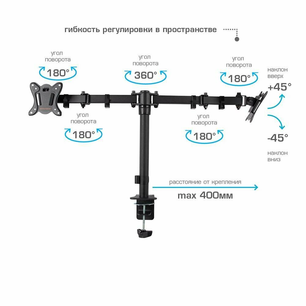 Кронштейн для мониторов Arm Media LCD-T13 Для 2-Х 15"-32", max 2х8 кг, настольный, 5 ст свободы, поворот 360°, высота штанги 400 мм, max VES