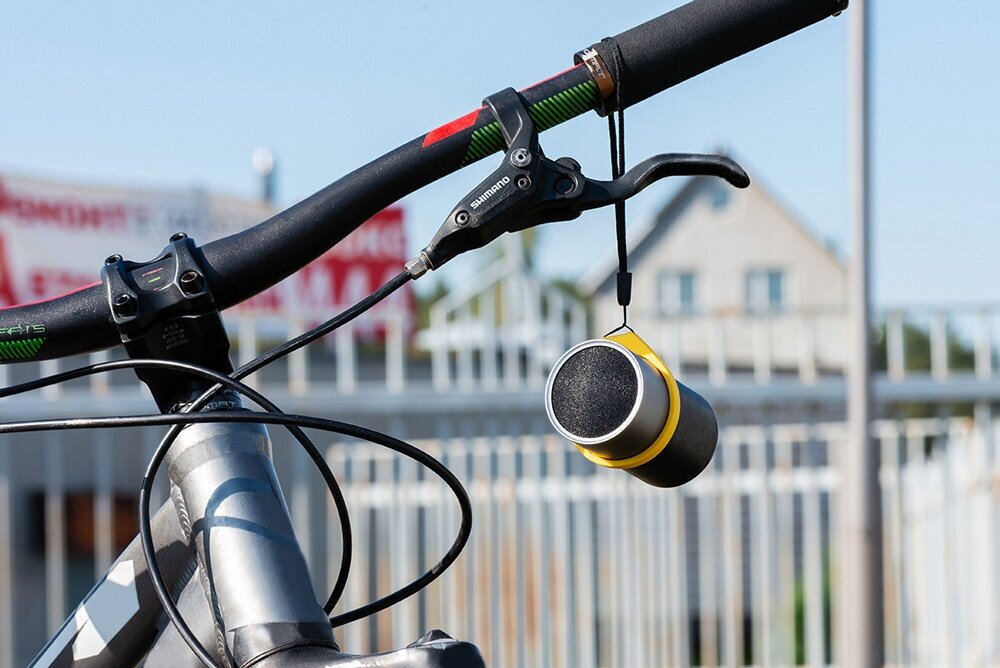 Портативные колонки, которые можно вешать на руль велосипеда, на карабин, на рюкзак. Да на что угодно.