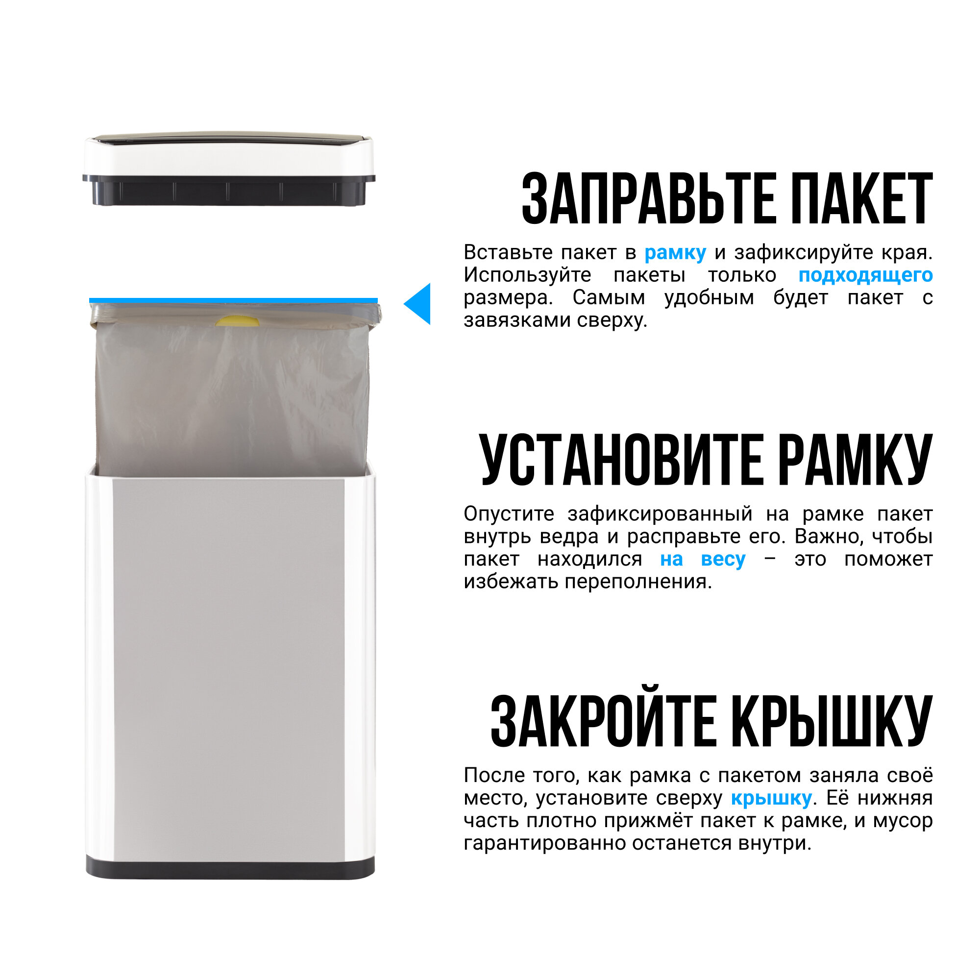 Сенсор работает отлично. Пакет не рвёт, но мы сразу развернули ручку на задней стенке обратной стороной. Пакет удобно доставать и вставлять. |