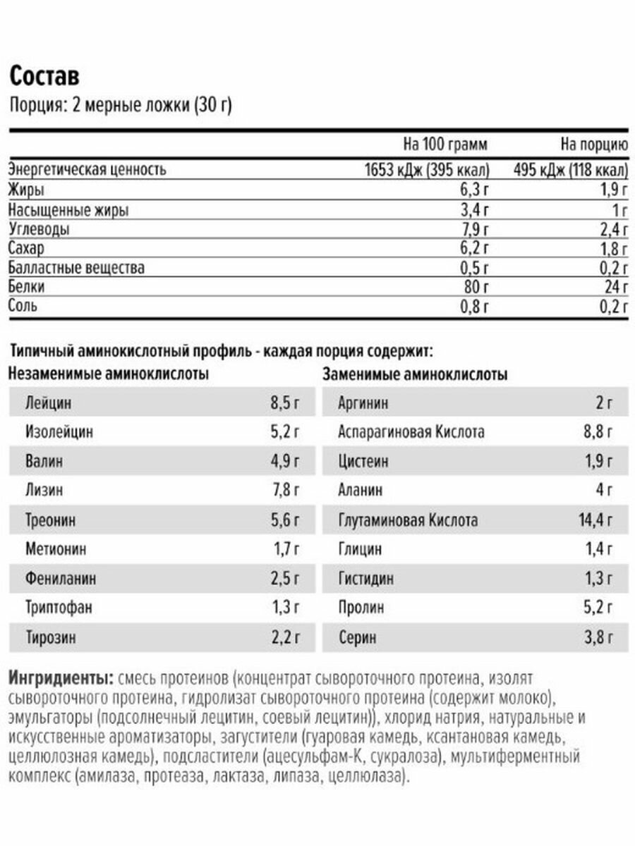 Сыворотка сама по себе хорошо усваивается, так еще и мультиферментный комплекс добавили. Вкус приятный, хотя малину с белым шоколадом заказал по ошибке и думал не понравится, а на деле очень приятно пахнет и вкус на высоте - очень рекомендую попробовать, Я вкуснее протеина еще не пробовал. За такую цену идеальный выбор. |